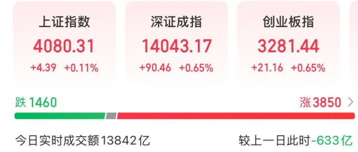 A股早盘低开,随后震荡拉升,截至上午收盘,上证指数上涨0.11%,深证成指上涨0.65%,创业板指上涨0.65%,逾3800只个股上涨。