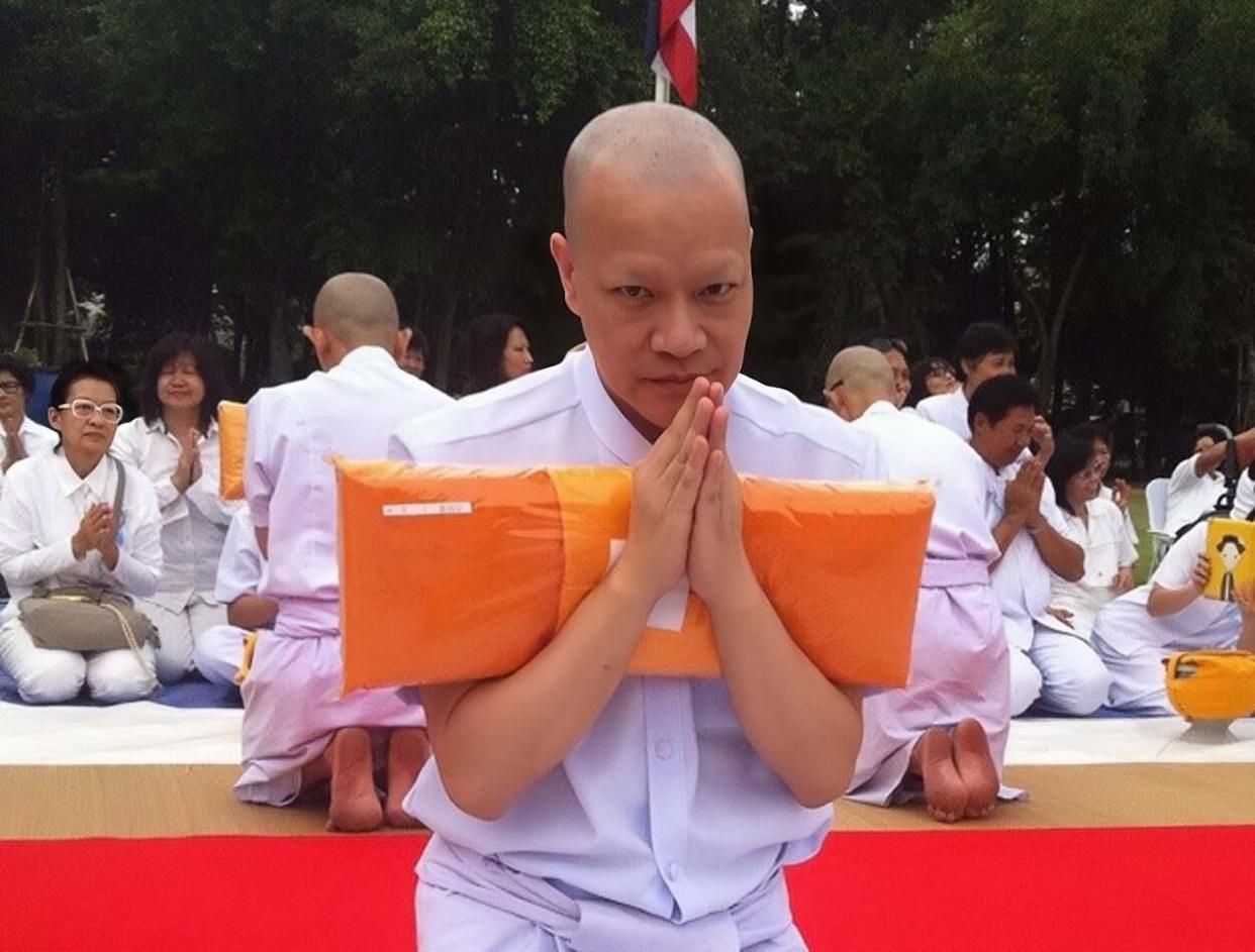 其实在这之前他就去过泰国出家。 2016年他54岁,跑到曼谷近郊的法身寺剃度,头发眉毛都剃光,像个初生婴儿。 每天上佛学课,静坐修行,一天只吃两餐,过午不食,还要出去化缘。 刚开始不适应,病了二十天,但他还是坚持下来了。 他说想通过出家找到自己是谁,为什么来到这个世界。